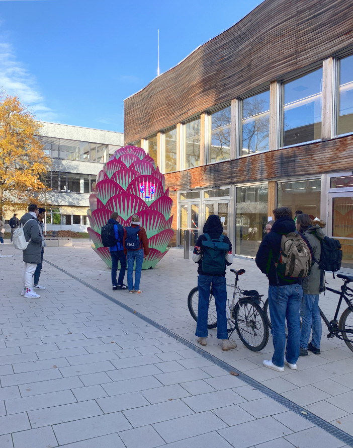 She has just materialized in Erlangen, Bavaria, near two newly built university auditoriums, to inform the local science and engineering students about their marvelous future achievements.